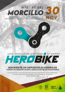 El Área de Deportes del Cabildo de El Hierro informa de la apertura de inscripciones para la prueba MTB – XC del Morcillo, correspondiente a la Liga Insular de Ciclismo El Hierro – HEROBIKE. La carrera se celebrará el sábado 30 de noviembre, con entrega de dorsales de 10:00 a 10:30 h y salida prevista a las 11:00 h, en el aparcamiento de La Hoya del Morcillo.